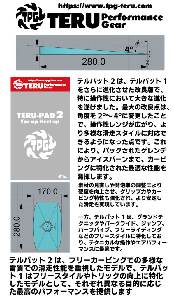 TERU PADは、前足にトーアップ、後足にヒールアップの設定が可能で、ターン時のエッジングやボードの反応性を向上させる効果があります。